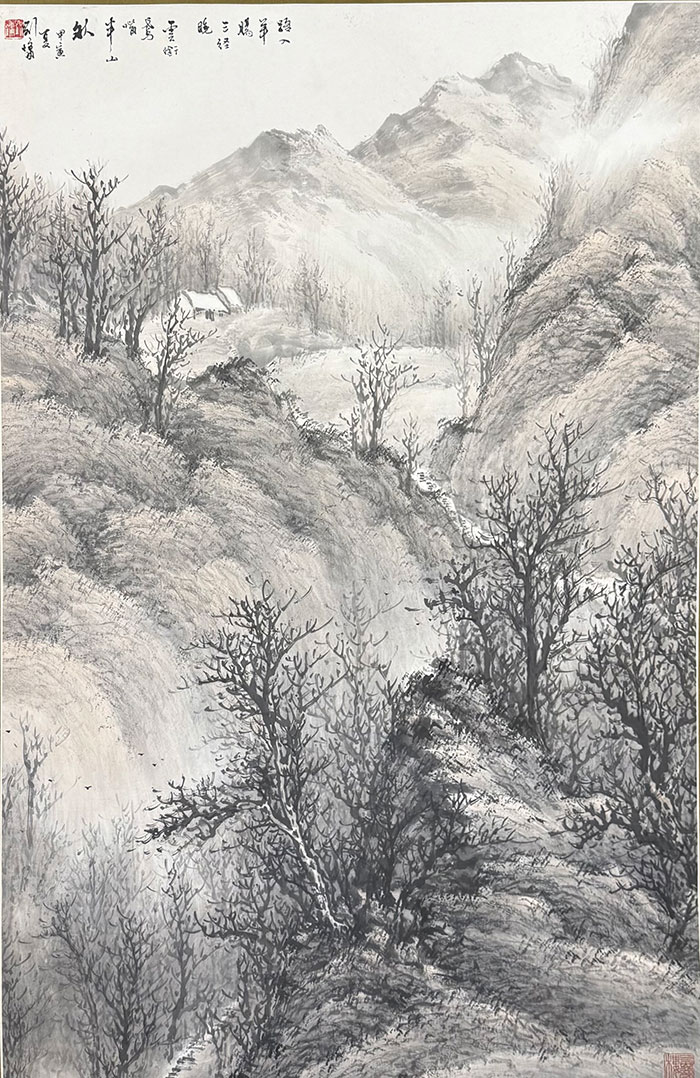 如展览前言所述:刘墉的山水题材画作呈现出古典与现代、写实与虚幻、师古与创新等多重面貌。其传统笔墨功底扎实,文化积淀厚重,笔下作品蕴含古意、暗合诗境,既精准诠释“师古而不泥古”的创作理念,更将对中华传统文化的深刻体悟融于毫端。在“师古”基础上,刘墉尤重实景写生。他以自然为师,观察自然,研究自然,行旅之中随画笔记录风光景致,秋林寒草、群山飞瀑、烟岚云岫、曙光映照等自然风景皆是他描绘的对象,通过内心的感悟转化为诉诸笔端的视觉图像。他亦未囿于传统山水技法的藩篱,具有实验和创新精神的他以“喷染褶皱皴擦法”为突破,创作现代水墨作品。