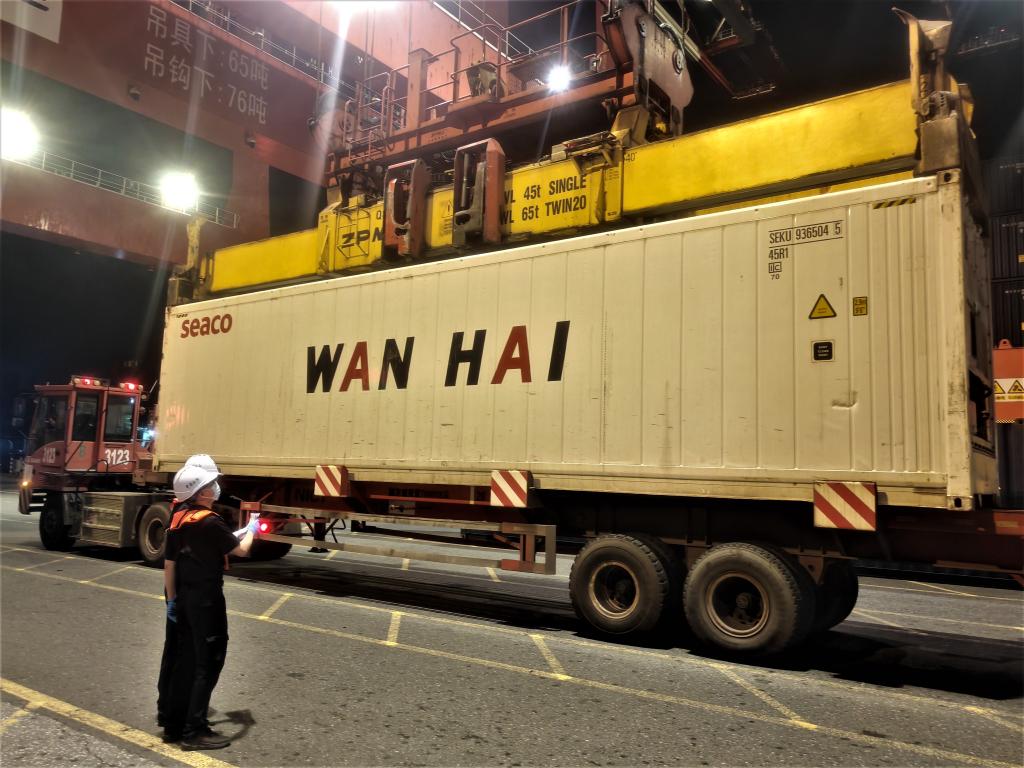 4月14日晚,南沙海关关员监管装载泰国榴莲集装箱卸船。新华社发