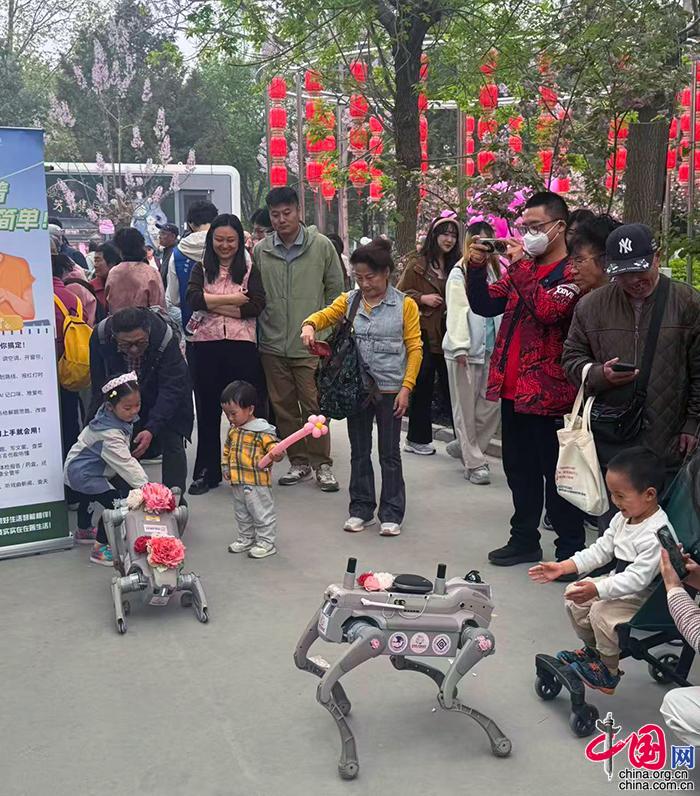 “智游花海”AI互动导览平台化身“随身导游”,游客扫码即可获取智能导览、牡丹科普与AI识花问答。两台AI四足机器狗灵活穿梭园区,在自主巡逻、智能预警的同时,与游客互动游戏。