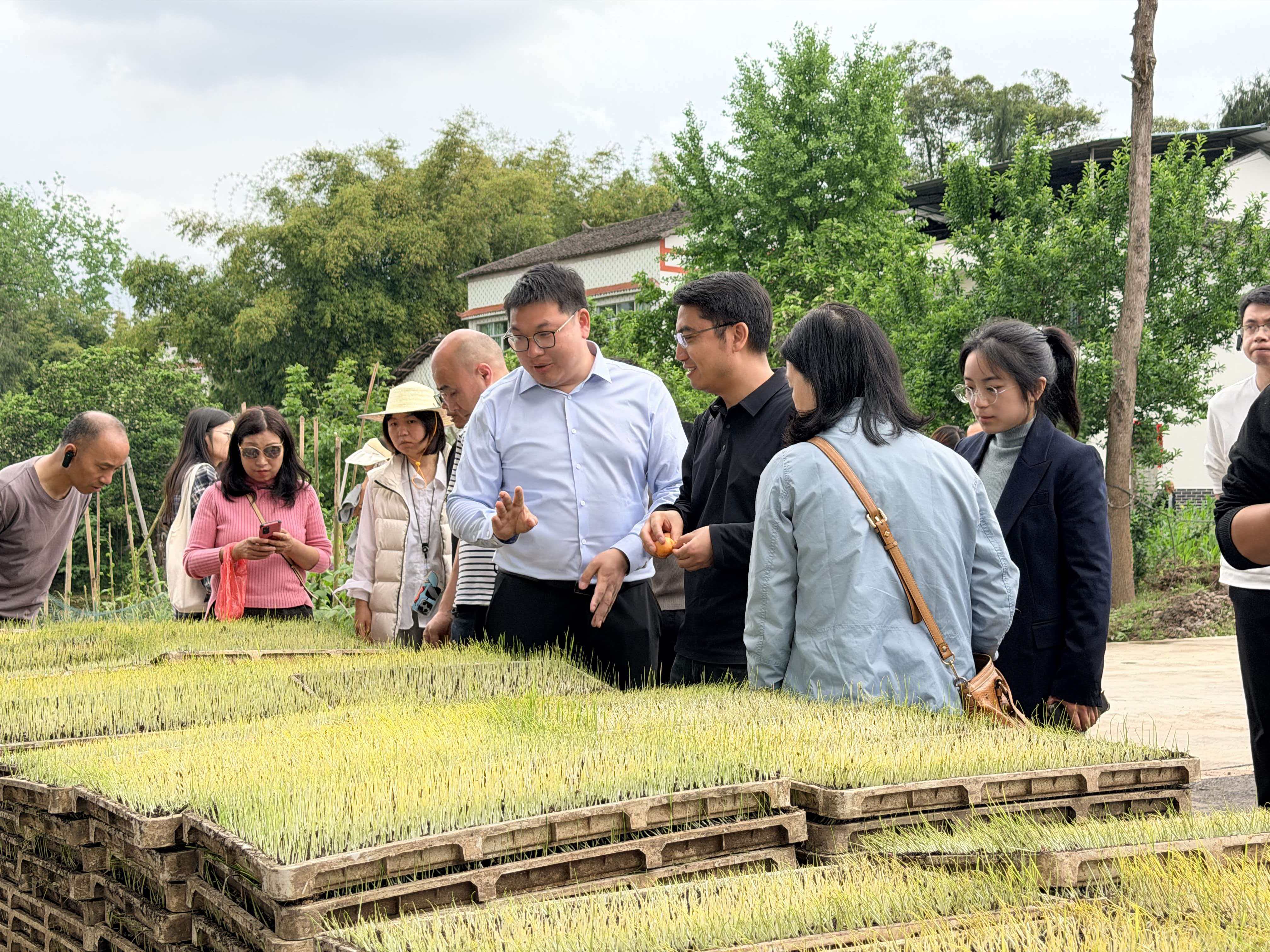 最后一站,学员们走进花桥镇光荣村水稻集中育秧基地。步入育秧工厂,自动化流水线高速运转,铺土、消毒、播种、覆土、叠盘,工序一气呵成。四川农业大学教授陈勇站在生产线旁,掰着指头给大家算账:“这条流水线一小时能育2000盘秧苗,相当于100亩田地的用秧量。机械化育秧结合暗化催芽技术,不仅能使育秧成本降低一半,还能显著提升秧苗质量。”业主宋辉接过话茬:“我们现在采用机械化插秧,每亩成本可节约100元左右,亩均产量能增加100公斤以上。”与传统人工种植相比,机械化作业不仅大幅提升效率,更能精准控制行距、株距及插秧深度,使秧苗分布均匀、通风透光,有效减少病虫害发生。目前,花桥镇5.5万亩水稻插秧工作正高效推进,插秧机已然成为田间最忙碌的“春耕特种兵”。现场学员们踊跃提问,针对“为何不推广稀播长秧龄做法”“晚稻前茬作物晚收时如何控制秧苗高度适配机插”等实际难题,陈勇教授逐一耐心解答,现场交流氛围十分热烈。
