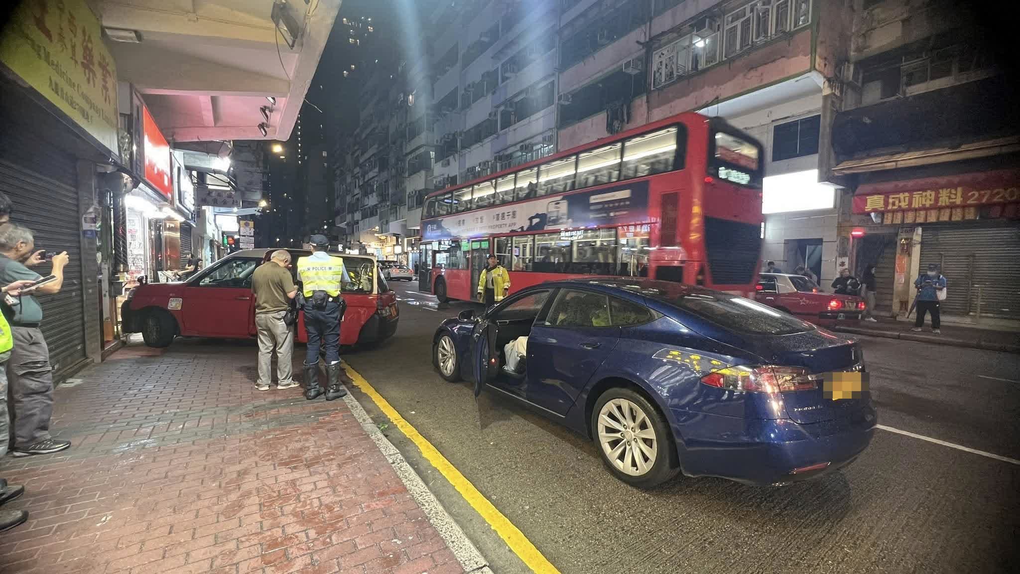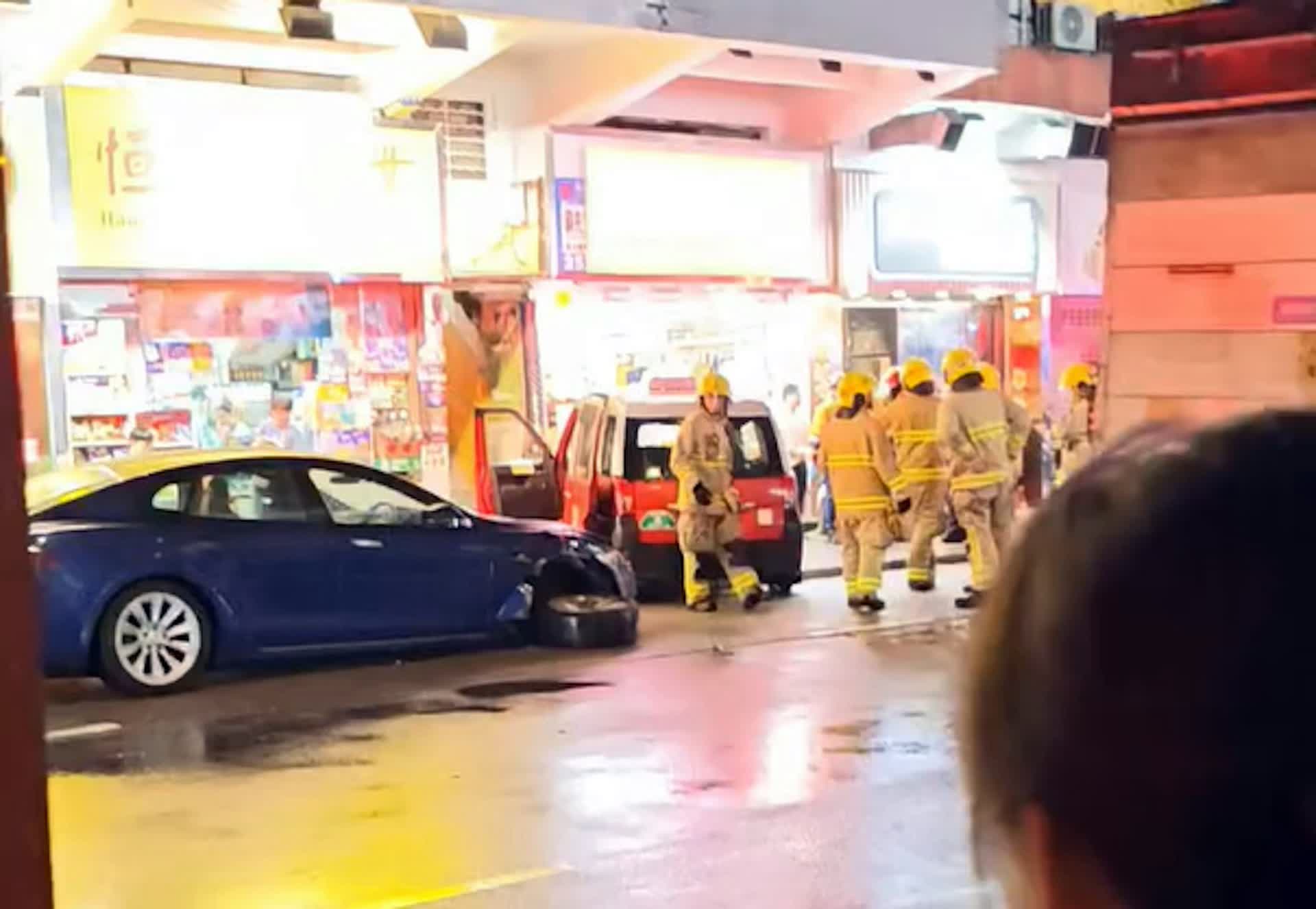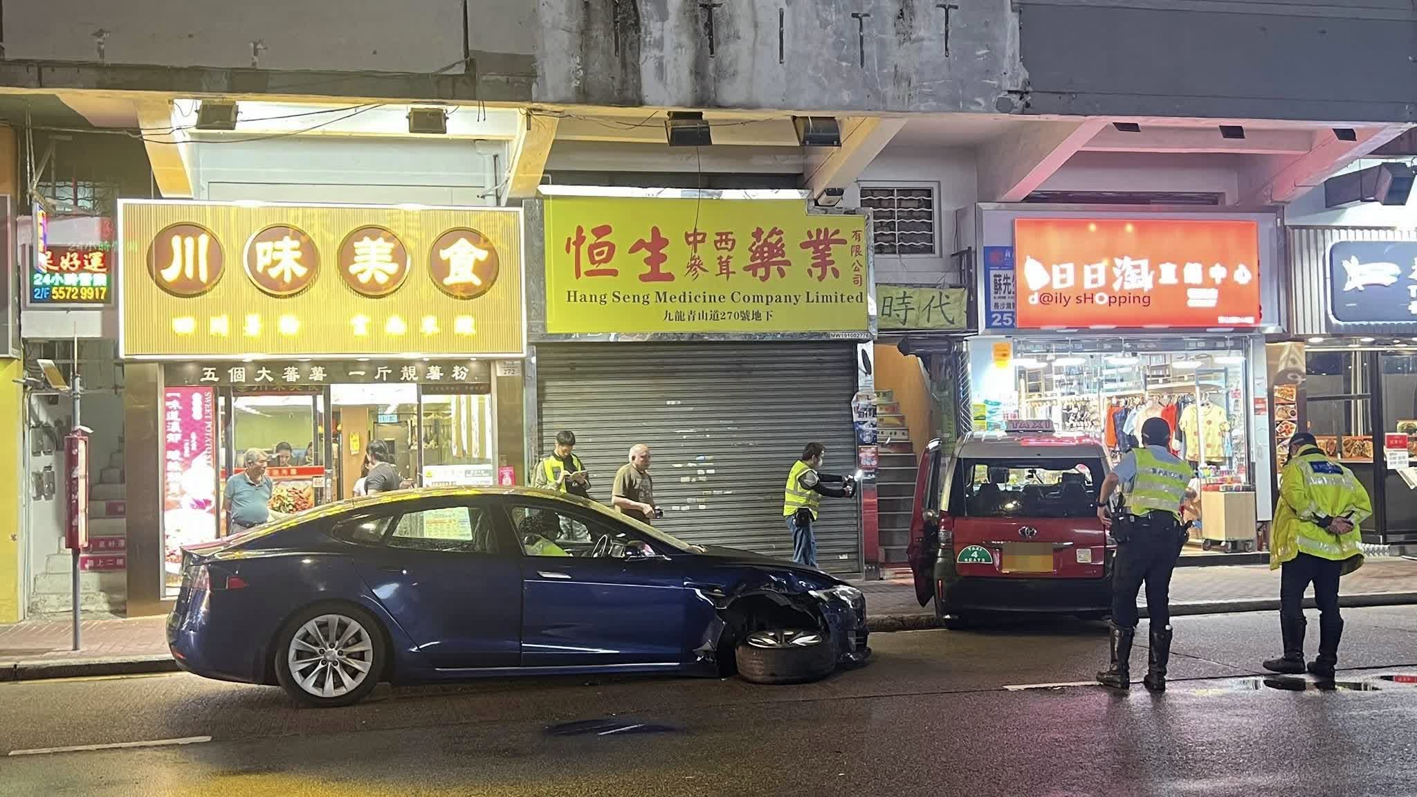 據了解,事發時該輛Tesla電動車沿青山道左線行駛,的士由中線切向左線時意外撞向Tesla電動車的右邊車頭及車輪,再失控剷上行人路。現場可見失事的士剷上行人路後,車頭泵把已碰及店舖門口的紙巾雜貨,店舖職員事後頻呼4個好彩:「好彩今日冇返貨,冇堆貨,冇人經過及冇人受傷!」至於被撞的Tesla電動車右邊頭輪甩脫。