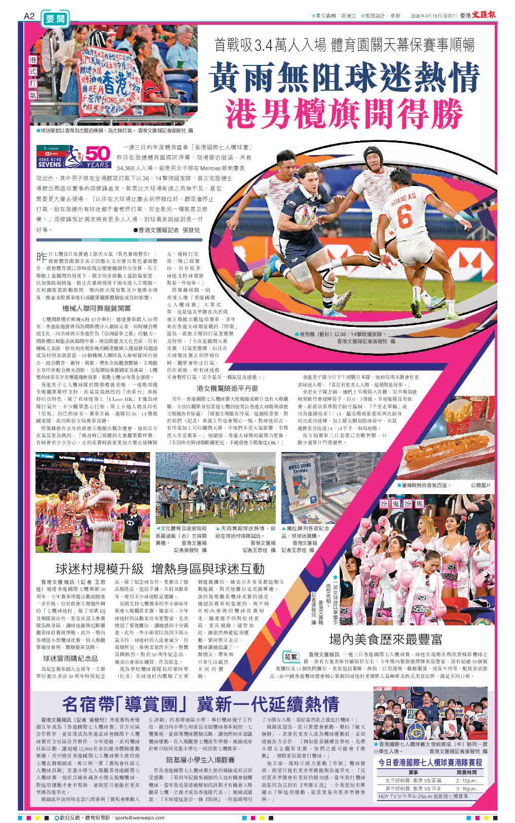 另外,香港國際七人欖球賽大使姚錦成昨日也有入場觀戰,今次以觀眾身份重返七欖的他笑言香港大球場與啟德主場館各有好處,「啟德主場館有冷氣,這個很重要,對於你們(記者)來說工作也會開心一點。對球迷而言,有冷氣加上可以關閉天幕,令他們不受天氣影響,全程投入享受賽事。」他續指,香港大球場的凝聚力更強,「全因座位與球場距離更近,不過啟德主場館也OK!」
