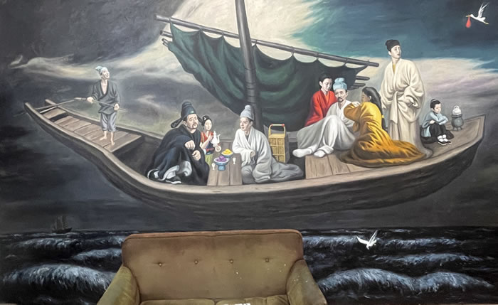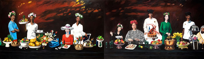 正墙上的《曼谷的夏天》,则是关注故事如何在巨幅绘画中生成。画中的主人公郑林,有着各种传奇性的故事,于是,秦琦决定在画中组织一场具有东南亚风情的VIP晚宴。觥筹交错间,一幅艺术与财富交织的长卷徐徐展开。此情此景,总会令人想起达芬奇笔下的《最后的晚餐》。