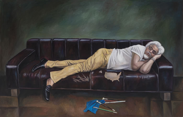 他总是穿着定制西装、骑着哈雷摩托,穿梭于夜晚的酒吧和雪茄屋之间。展厅的最后,浪漫的故事成为宁静的结尾。画家躺倚在柔软的沙发上,逐渐进入梦乡。这个场景被秦琦描绘得典雅,沉郁而又温柔。只是那个令人松弛的古典沙发上,有着一个形似美国地图的补丁,它与写实的人物形成微妙的错位,在日常的慵懒中注入了一丝超现实的荒诞感,平静的静谧中也多了一丝耐人寻味。