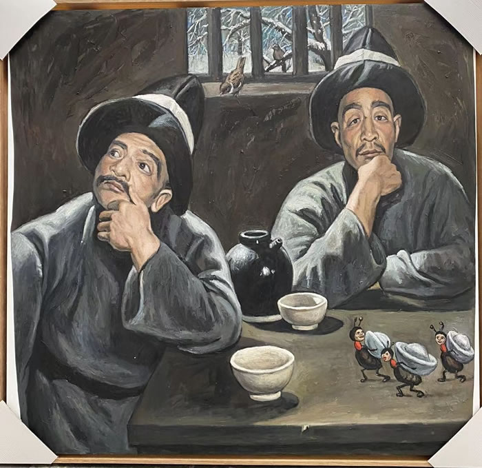 然而,电影并不能解释秦琦作品中多重并置和混合的荒诞感。在一张有两个清代人的画中,画面的 氛围、搬运银子的蚂蚁、远处的喜鹊,又为我们呈现了连环画、插图、年画、中国老电影厂动画片对于秦琦的影响。这些不同的语言与形式、画中人亦真亦假的扮演,制造出故事里的多种层次。