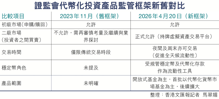 證監會2023年11月的舊框架只允許初級市場交易,二級市場需再審慎考量;而昨最新公布新框架中,正式開放代幣化產品在持牌虛擬資產交易平台進行二級市場買賣,讓產品從「單向通道」變成「雙向流通市場」,大幅提升流通性。