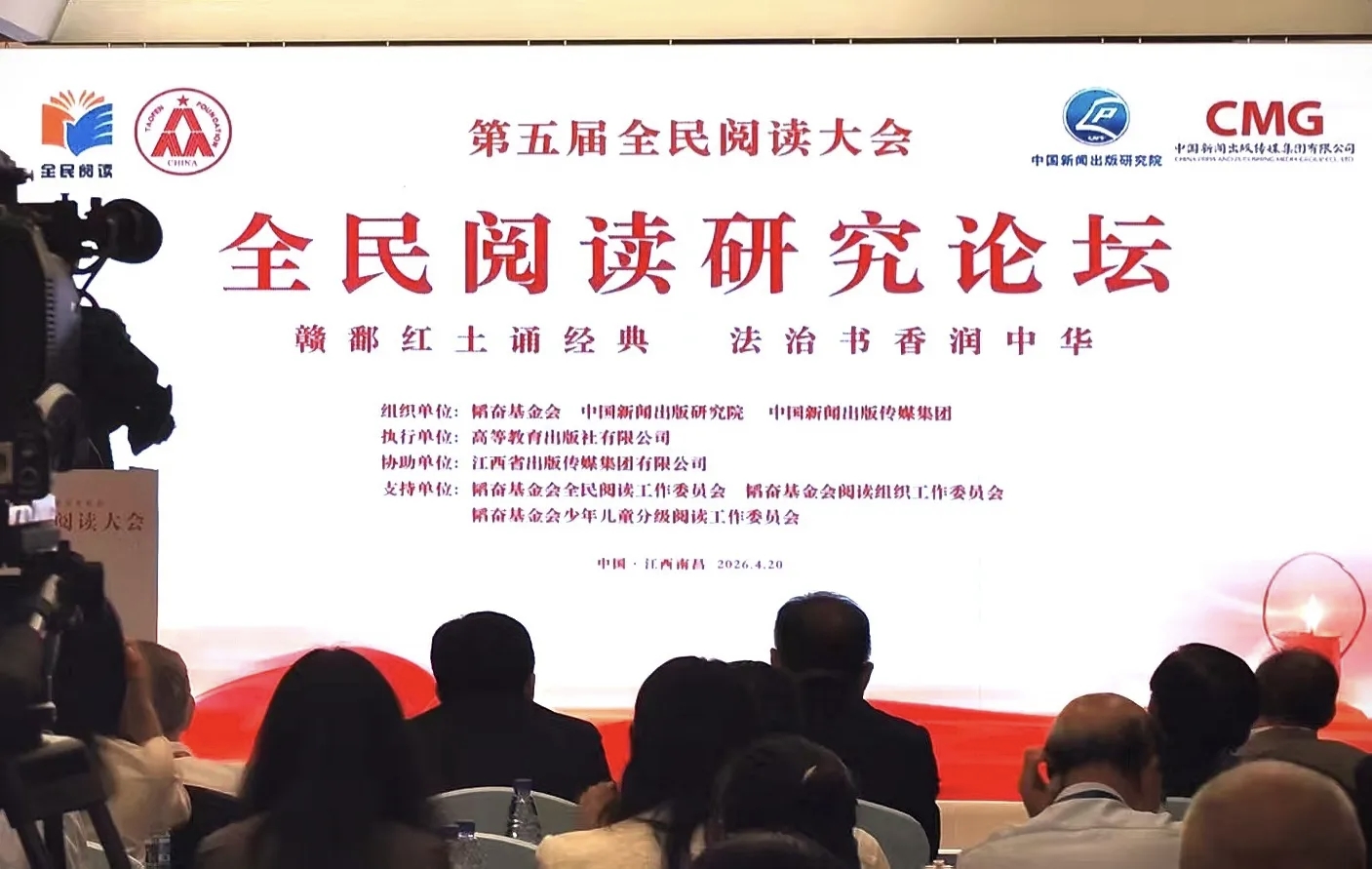 4月20日,第五届全民阅读大会·全民阅读研究论坛在江西南昌举办。全国政协副主席、民进中央常务副主席朱永新,江西省政协主席宋福龙,中国外文局局长常勃出席论坛并致辞,中国出版集团、中国教育出版传媒集团等单位负责人及全国出版、教育、学术、媒体界等百余位代表参加论坛,围绕全民阅读理论创新、红色基因出版转化、数智时代阅读服务等话题深入研讨交流。论坛以“赣鄱红土诵经典,法治书香润中华”为主题,由韬奋基金会、中国新闻出版研究院、中国新闻出版传媒集团等单位联合主办。