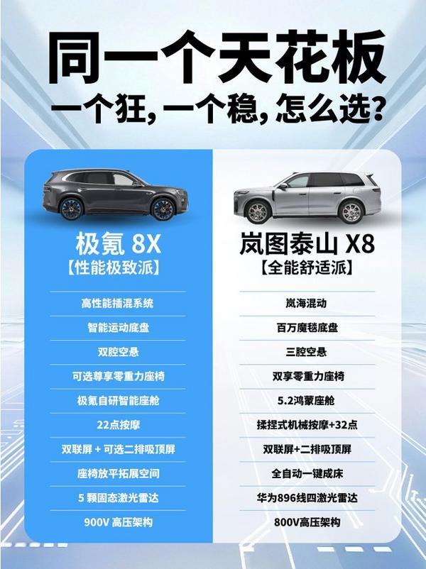 作为岚图港股上市后第一车,泰山X8搭载同级独有的双向16度后轮转向、三腔空气悬架,配备二排双享零重力座椅、2.1米全自动一键成床功能、896 线四激光雷达与华为新一代智能座舱,核心配置全面对标甚至超越同级竞品。结合卢放“价格值得期待”的表态,业内普遍猜测,泰山X8的预售定价或将直接锚定极氪8X、问界M8等头部竞品,并在相同的价格区间内提供越级配置,有望给出更具竞争力的预售价格。