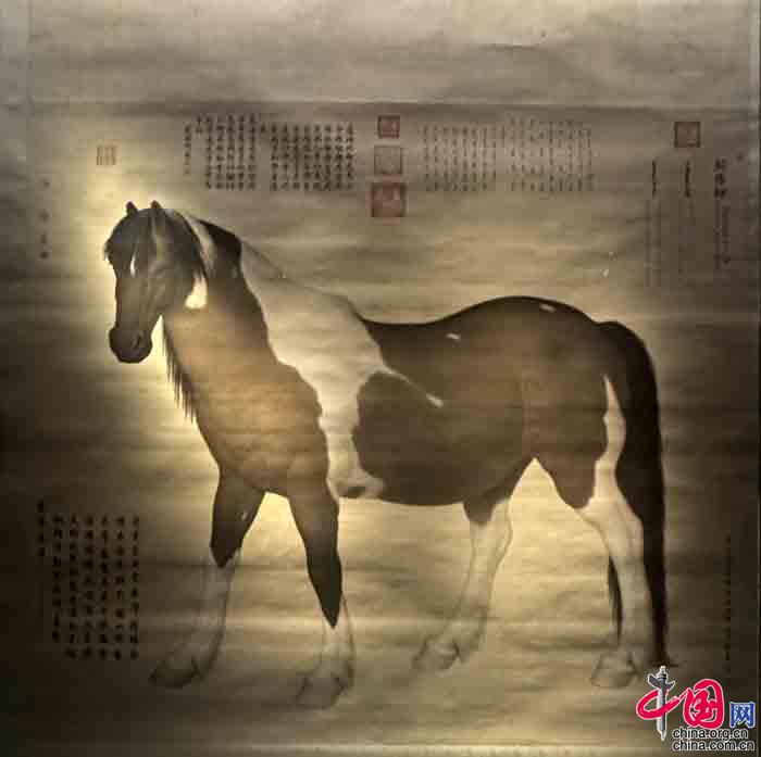 本次展览还展出了清代郎世宁的《阚虎骝图》轴。郎世宁曾奉敕先后创作清高宗弘历所乘骏马十匹,名曰《十骏图》。其中第二轴为“阚虎骝”,寓意勇猛如虎。马身棕白相间,鬃毛细而不乱,渲染自然,富有层次。