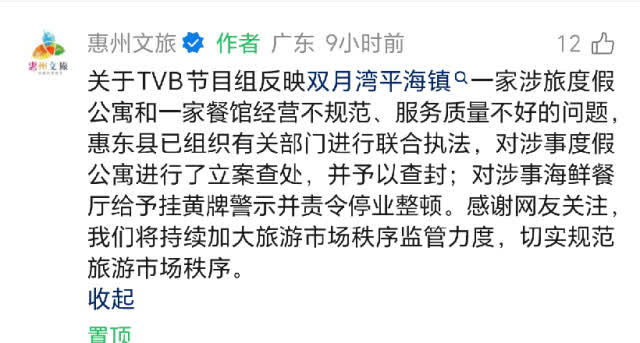 關於TVB節目組反映雙月灣平海鎮一家涉旅度假公寓和一家餐館經營不規範、服務質量不好的問題,惠東縣已組織有關部門進行聯合執法,對涉事度假公寓進行了立案查處,並予以查封;對涉事海鮮餐廳給予掛黃牌警示並責令停業整頓。感謝網友關注,我們將持續加大旅遊市場秩序監管力度,切實規範旅遊市場秩序。