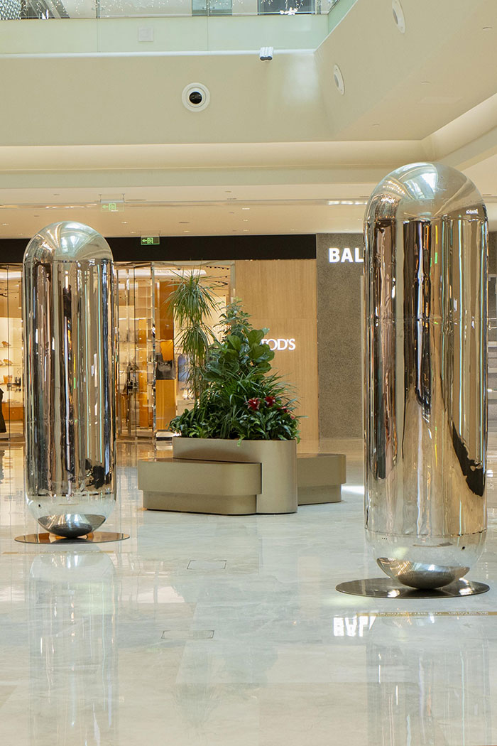 方二&孟瑾,《银色曼波》,2018-至今,不锈钢、水泥,260cm (h) × 78cm (Ø) ×5(单件作品尺寸),众望·国贸:北京当代艺博会公共艺术单元 展览现场