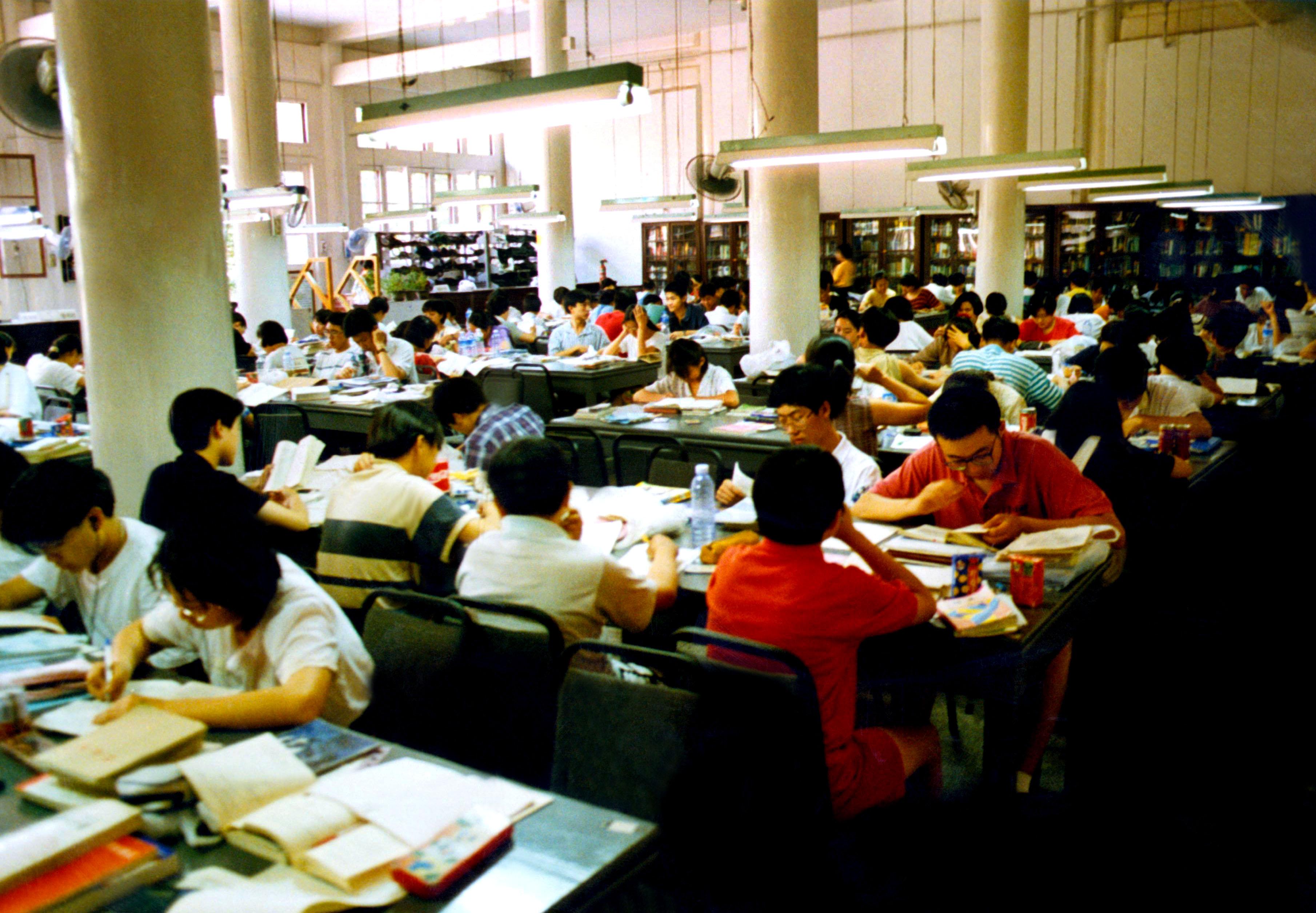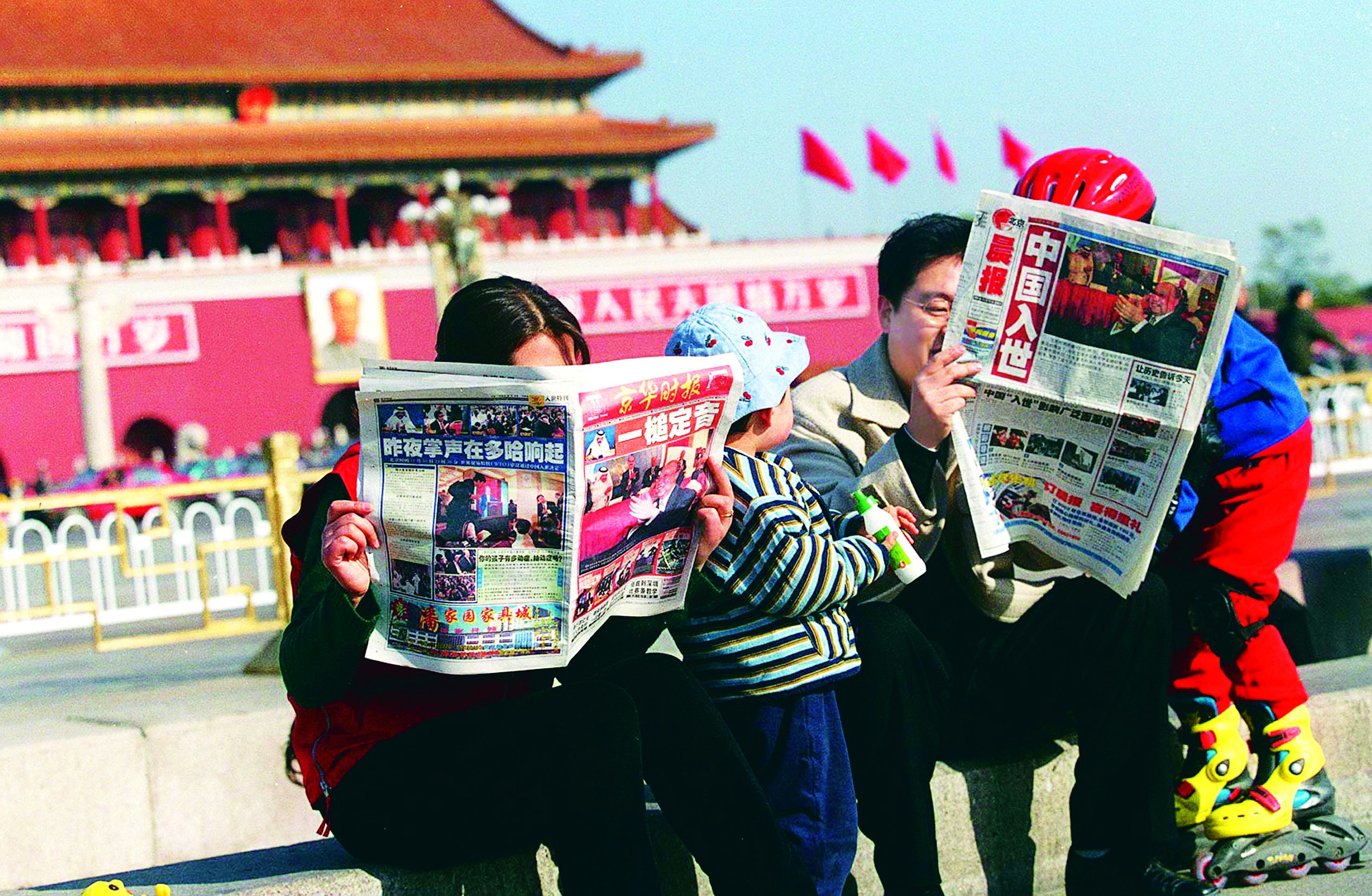 2001年,天安门广场上,人们通过阅读当日报纸了解中国加入世界贸易组织(WTO)相关新闻。
