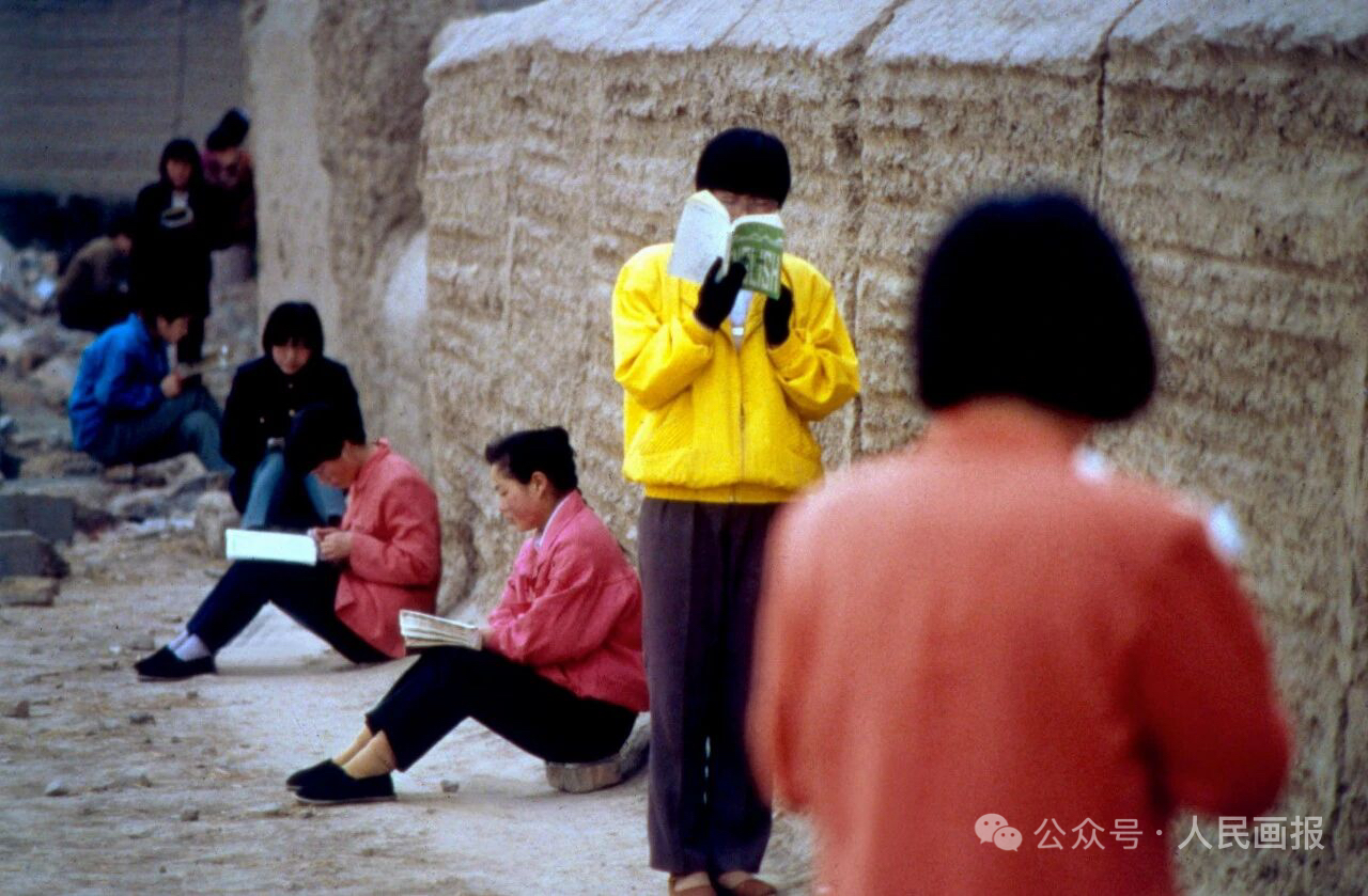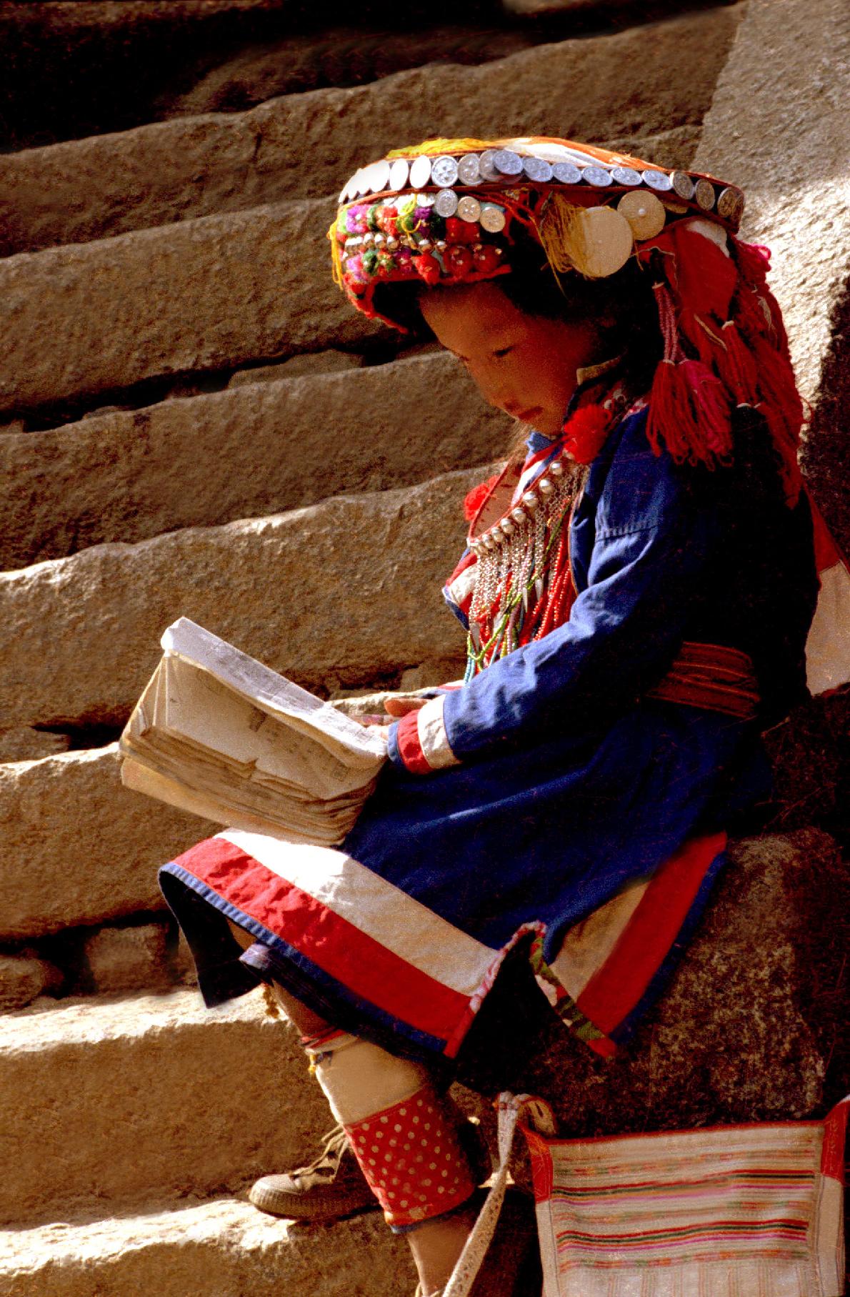 1984年,傈僳族的小姑娘坐在石阶上看书。