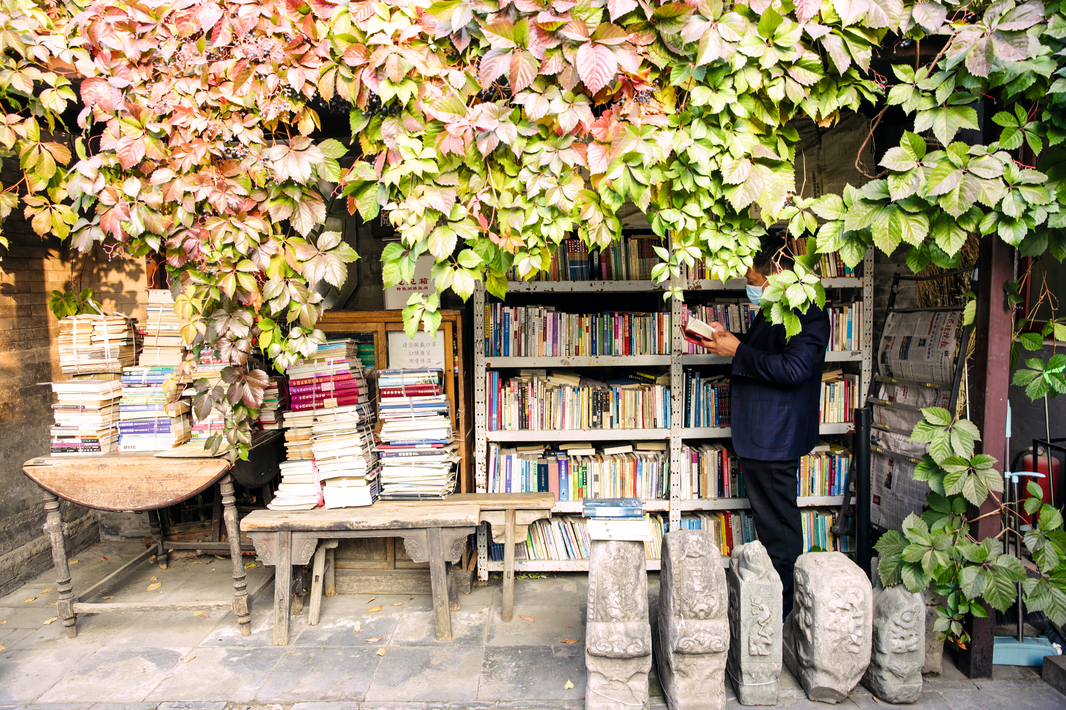 2022年,一名读者在正阳书局院内阅读书籍,书架旁陈列着形态各异的北京老门墩。摄影 秦斌