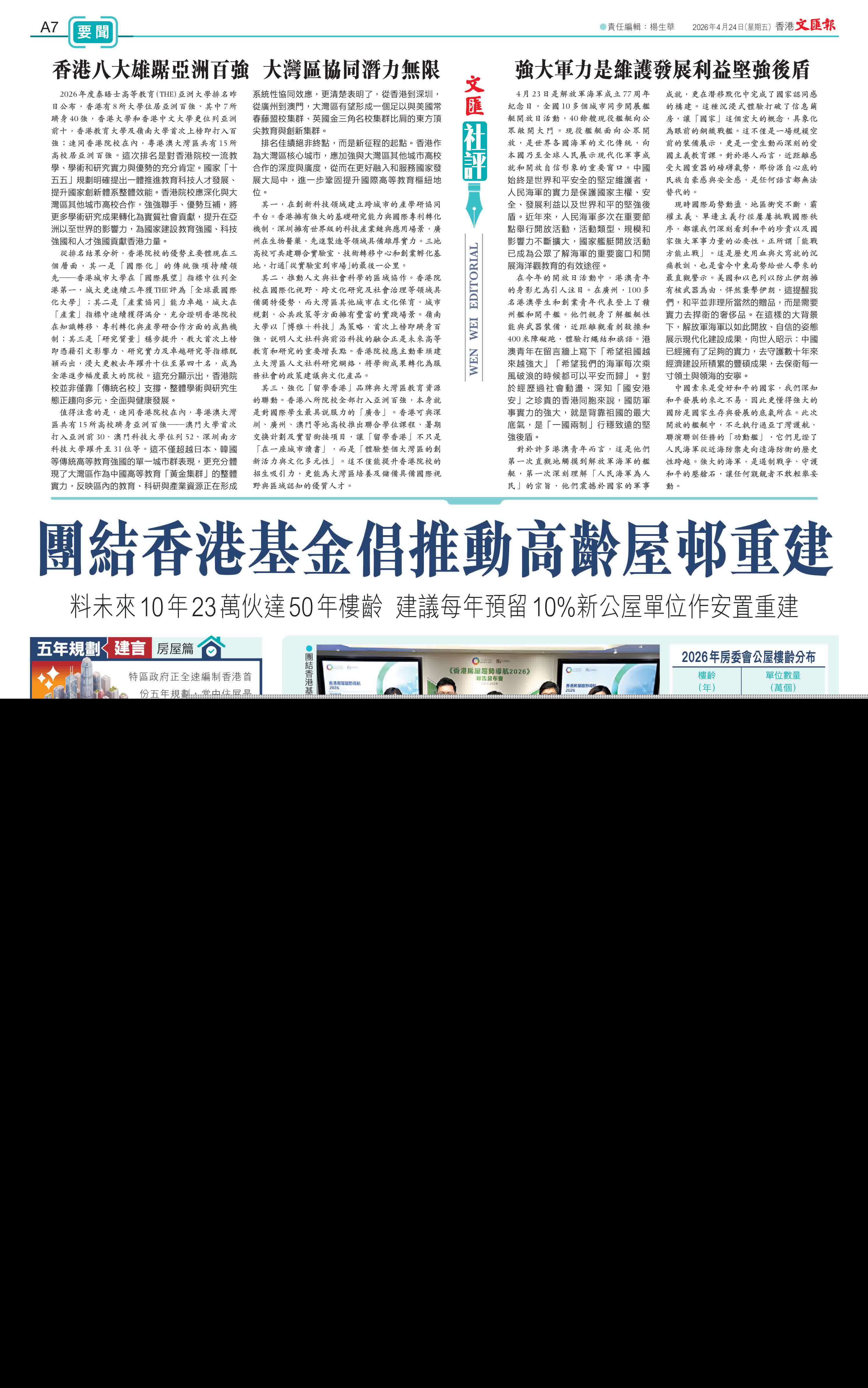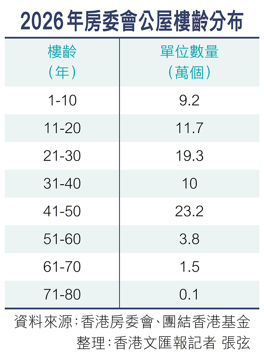 (香港文匯報記者 張弦)特區政府正全速編制香港首份五年規劃,當中住屋是重點議題之一。目前,香港有不少樓齡偏高的公共屋邨,團結香港基金昨日發表《香港房屋趨勢導航2026》報告,就公營房屋問題建言,預計未來10年,房屋委員會轄下將有超過23萬個公屋單位達50年樓齡,每個單位的平均維修及改善工程開支將持續上升,故提出三大建議,包括政府系統性推動高齡屋邨重建,當中以禾輋邨、大興邨、麗瑤邨及瀝源邨有較高重建價值;提議每年將10%至15%的公營房屋落成量,預留作安置受重建影響的公屋居民;並在合適項目增加重建後的資助出售房屋比例,將建屋淨支出大幅降低78%。