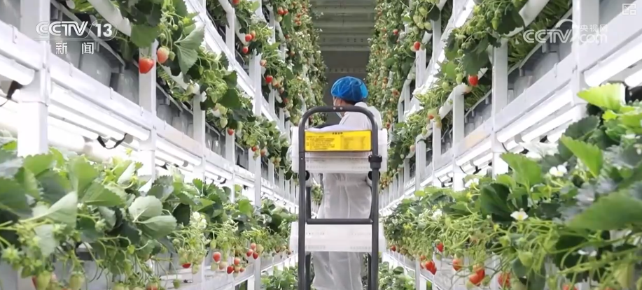 现在,这里正处在给草莓换茬阶段。每年3月开始,工厂就会将老植株淘汰,种上新苗。这个种植间的草莓是上个月刚种上的,长了不到一个月。工作人员介绍,目前,这里的草莓苗正处于生长期,再过半个月草莓就会进入开花期。预计到6月中旬,这里就会变成硕果累累的“草莓森林”。那时候,市场上的草莓逐渐变少,这里的草莓就会错峰上市。得益于立体种植加上科技赋能,这里的草莓单位面积的产量是传统种植的15倍,人工成本能降低一半。一颗草莓的“科技养成记”这里到底是如何用科技为小小草莓赋能的?首先,先看草莓的头顶。草莓的上方配备了LED补光灯,这是草莓定制光谱,能在草莓不同生长阶段自动调节强弱。此外,这里通过模拟自然通风环境,可以让草莓减少生病、长势更稳,手放到这还能感受到微风徐徐、清爽通透。
