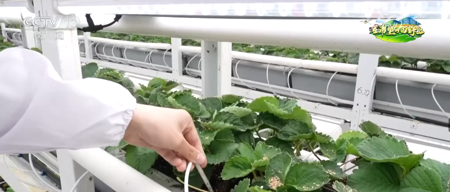 这里有个细节,这个白色的箭头它的名字叫“滴箭”,通俗点说,就是草莓种植的水肥灌溉“神器”,长得像小箭头,一头连细水管,尖头直接插进草莓根部基质里。这也是精准水肥一体化的关键,系统会按需自动调配营养液,通过滴箭直接输送到根部,营养均衡又节水节肥。放眼整个种植间,温室里的温度、湿度、二氧化碳浓度全部由传感器24小时实时监测。全程让草莓在适宜的环境里生长,工作人员在操控屏前就能实时管控、一键调控,助力小小草莓健康成长。绿电赋能兴产业 小草莓助力乡村振兴