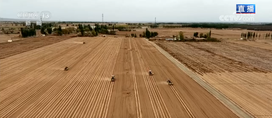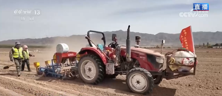 现在,许多农用机械正在地里播种,记者身旁的多功能复合播种机可以一次性完成铺膜、铺设滴灌带、播种、施肥等多道工序。大家看,这个地膜上有整齐排列的小孔,这就是机械播种留下来的播种孔。地膜里的这条管道就是滴灌管道,现在这里的农田大多采用膜下滴灌模式,能够精准送水、按需供水。地里还有一台搭载北斗导航的无人驾驶播种设备,不需要驾驶员把控方向,可以依靠卫星定位精准作业。