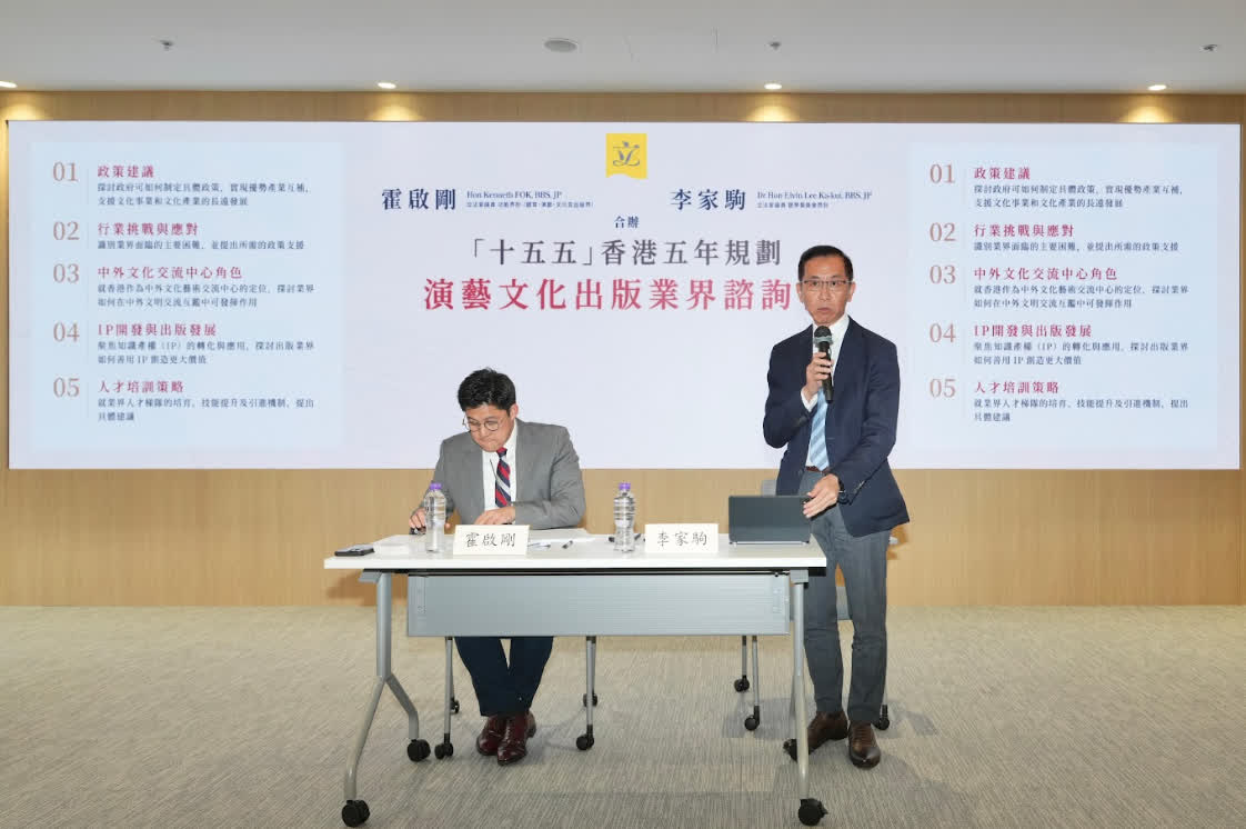 由立法會議員霍啟剛(體育、演藝、文化及出版界功能界別)及李家駒(選舉委員會界別)聯合舉辦的「十五五」規劃演藝文化出版業界諮詢會,4月22日下午假立法會綜合大樓5樓活動室圓滿舉行。近百名來自演藝、文化、出版及相關界別的代表應邀出席,共同就香港未來五年的文化發展策略交流意見,集思廣益。