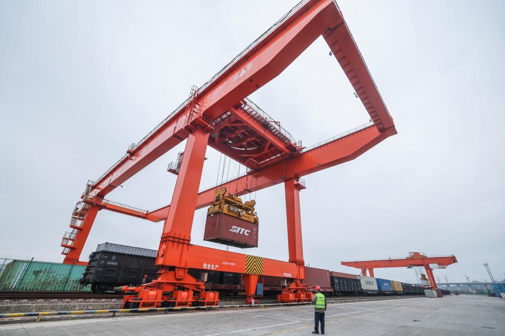 1月30日,在浙江义乌铁路口岸,一列载着红酒、葵花籽油、气泡水等进口商品的中欧班列回程班列在卸货。新华社记者徐昱摄