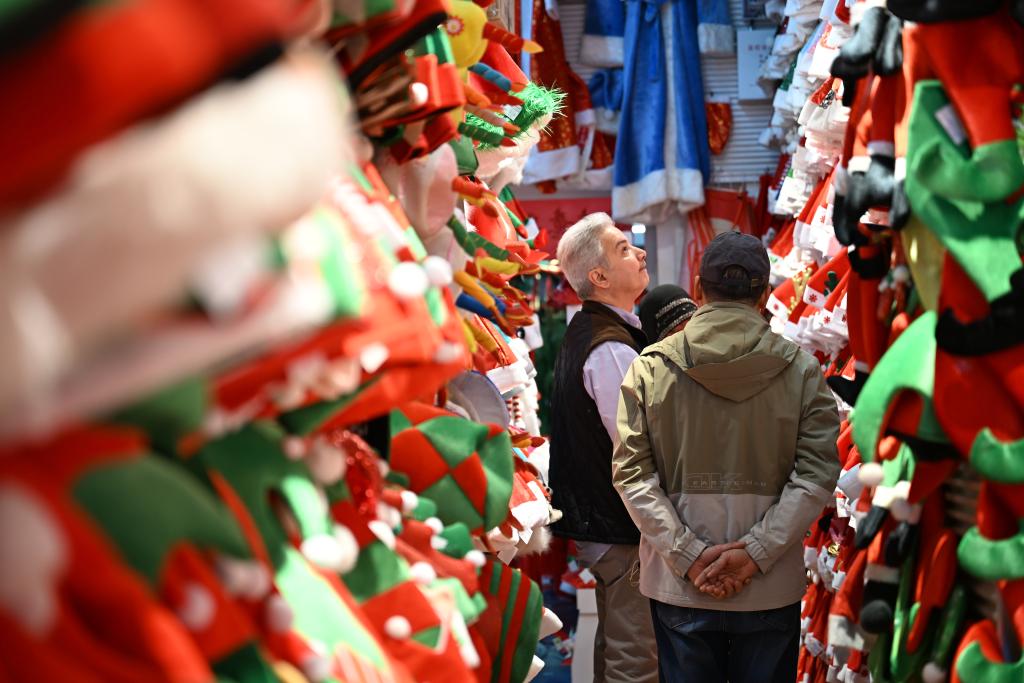 2025年12月17日,科威特商人在浙江义乌国际商贸城内挑选圣诞产品的样品。新华社记者刘铭翔摄