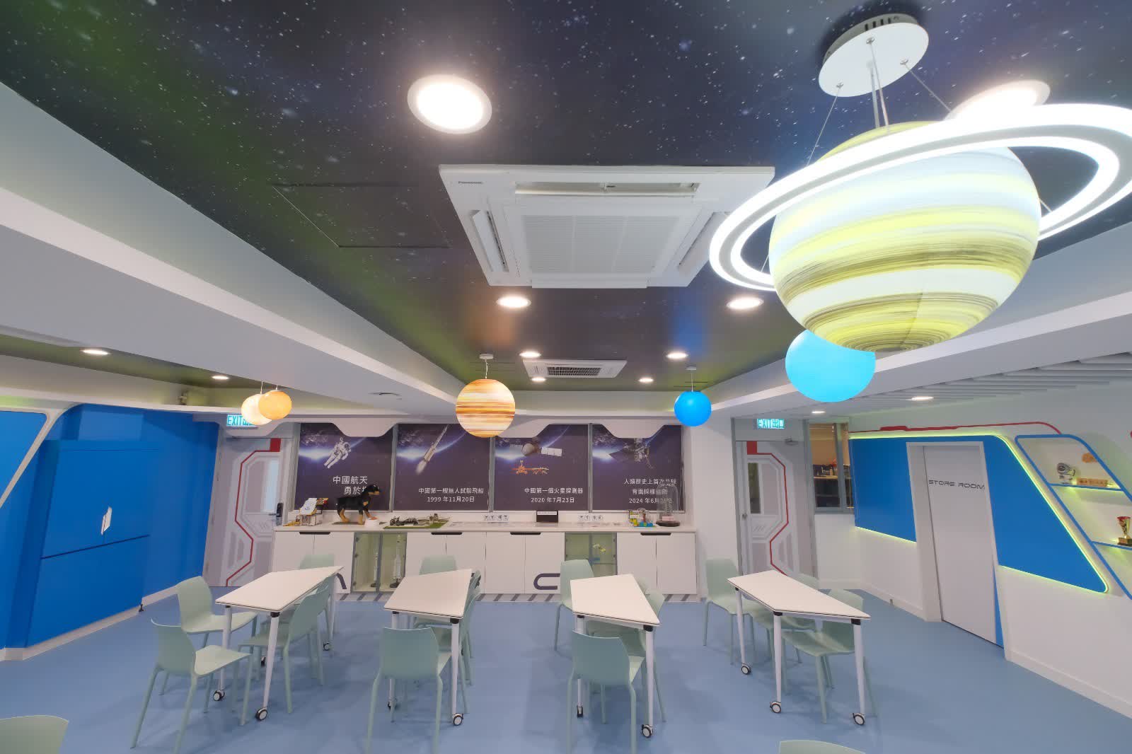 而學校在政府撥款、辦學團體支持和已故老師慷慨捐贈下,更特別投放逾300萬元在校內加建INNO Space及梁美琼科學實驗室,整個設計以太空為主題。馮嘉琪介紹指,其中科學實驗室設有互動牆「Think it. Test it. Know it!」,涵蓋科學科「物質、能量和變化」的範疇,學生可以藉此了解能量轉化,包括電力、聲音、齒輪的原理,太陽能及水力能轉化成為光能、聲音傳送等裝置。「透過科學互動牆,學生可親手接駁電路,將零件放上背板,觀察閉合電路如何令燈泡發亮、轉子轉動或發出聲音。」她表示,科學互動牆的太陽能板及太陽燈,當學生按下燈掣,儀表會即時顯示電壓(瓦數)變化,讓抽象的能源轉化變得視覺化;而齒輪組件,讓學生可動手組裝齒輪裝置,理解機械原理。
