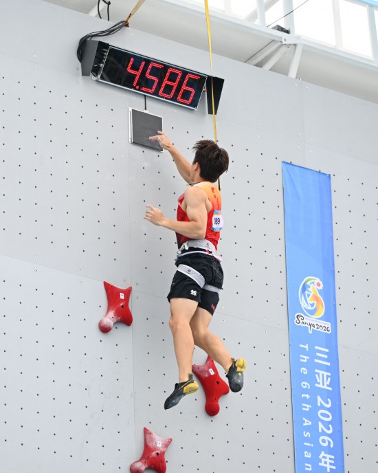 28日,中国队选手赵一程在第六届亚沙会男子速度攀岩预赛中,以4秒58的成绩打破该项目世界纪录。