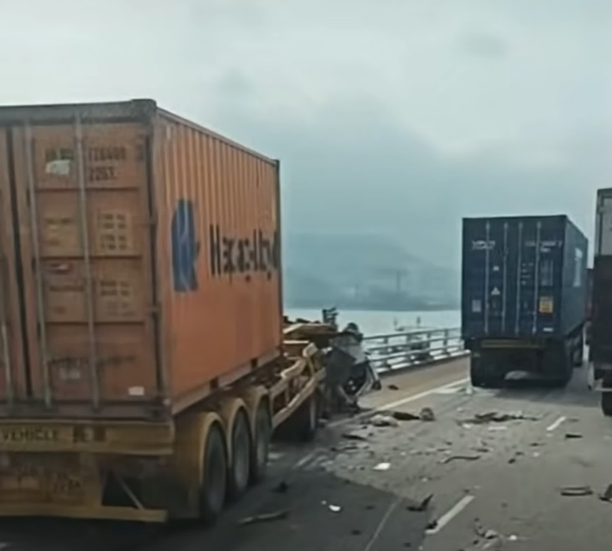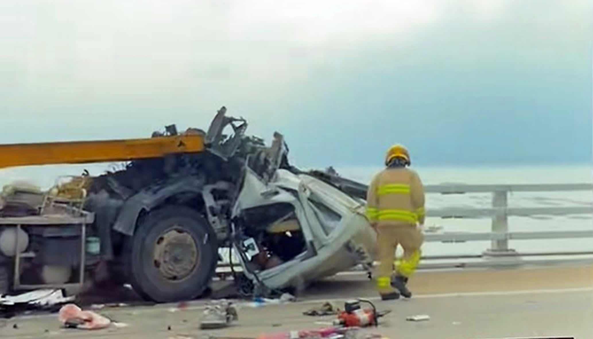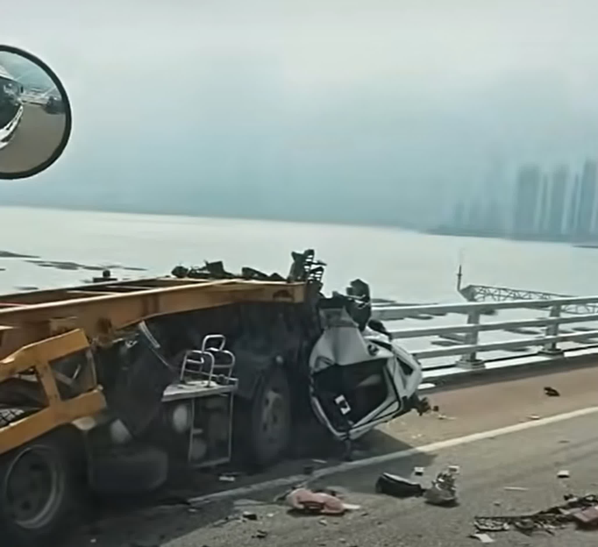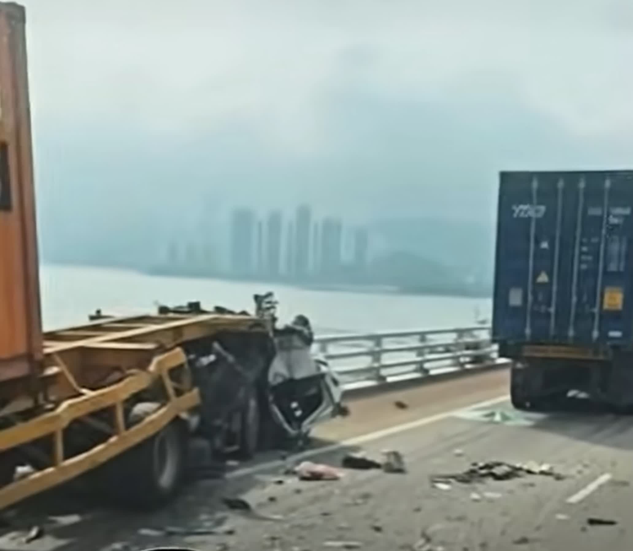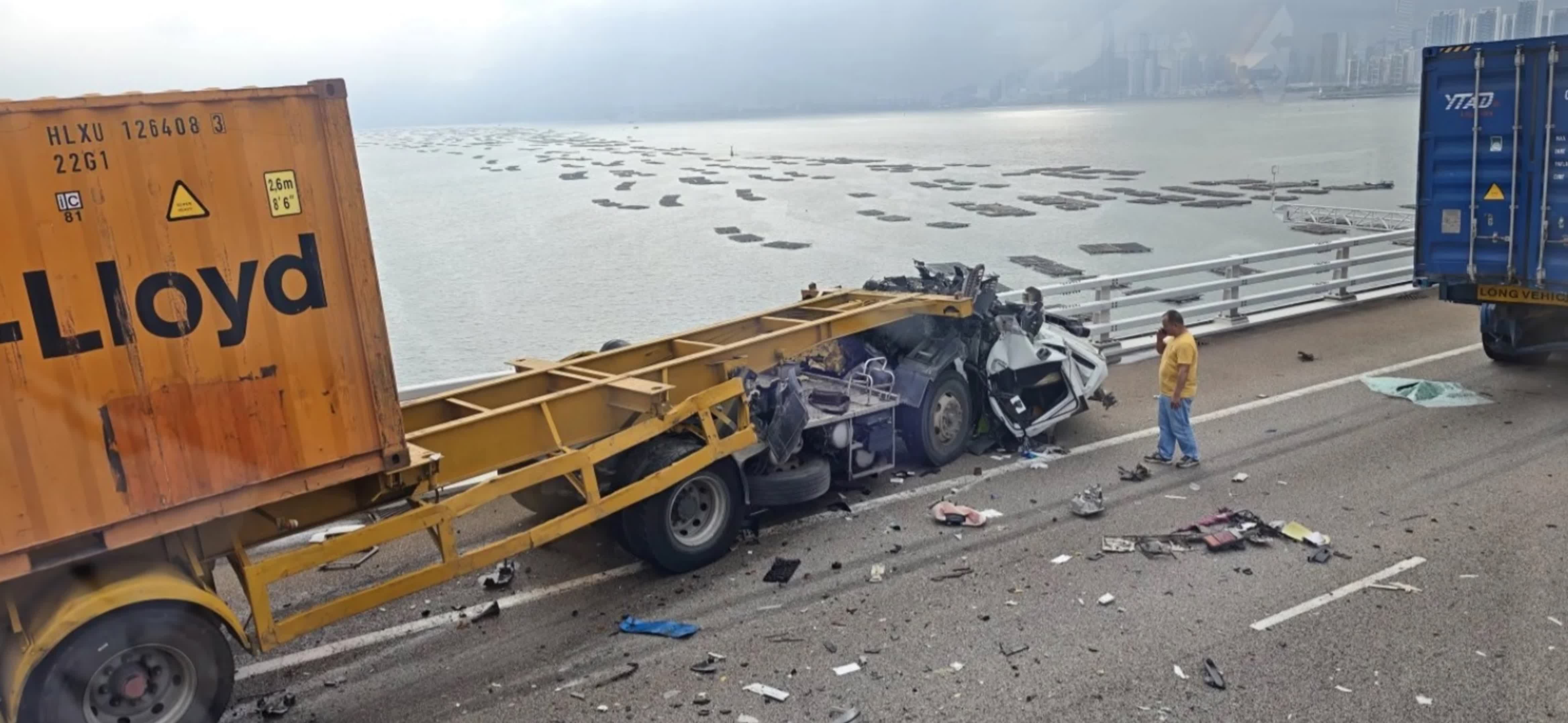 香港文匯報訊(記者 蕭景源)今日(29日)下午約3時29分在深圳灣公路大橋往深圳方向的大橋中段位置,有2輛貨車發生相撞。由網上片段可見,其中一輛貨櫃車的駕駛室被嚴重撞扁如同「消失」,路面散滿碎片和雜物,以及留有剎車胎痕。