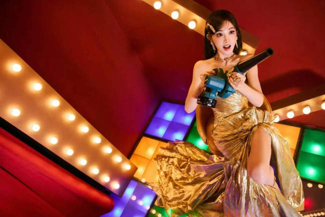 赵今麦穿金色吊带美丽又大方 单手托腮五官精致
