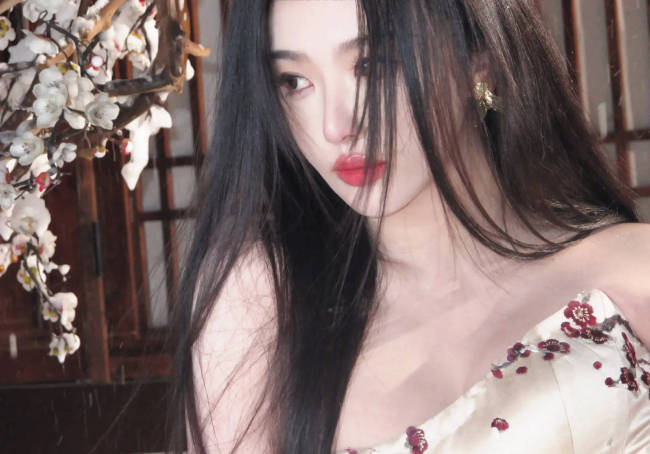孔雪儿穿抹胸梅花裙气质清雅 黑发垂肩似古典美人