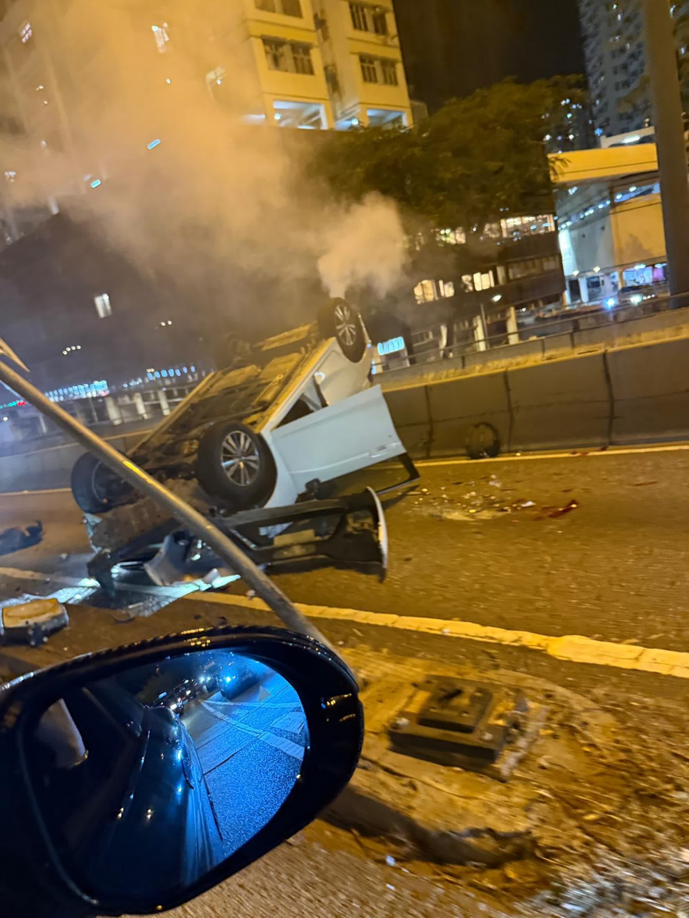 (有片)荃灣私家車失事反轉路中冒煙 司機受傷交通受阻